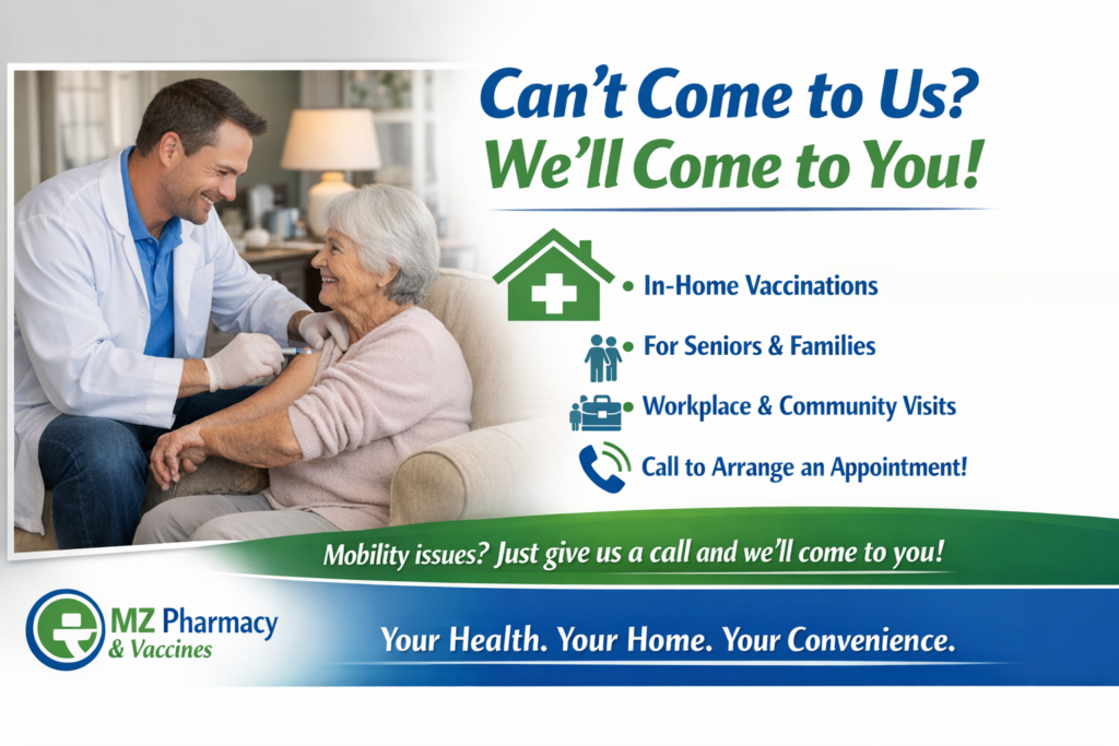 If mobility or transportation challenges make it difficult for you or a loved one to visit the pharmacy, we can come to you. Our licensed pharmacists offer on-site and off-site vaccinations for individuals, families, senior communities, and workplaces. Simply call us to arrange a visit at a time and location that works best for you. Your health and comfort always come first.